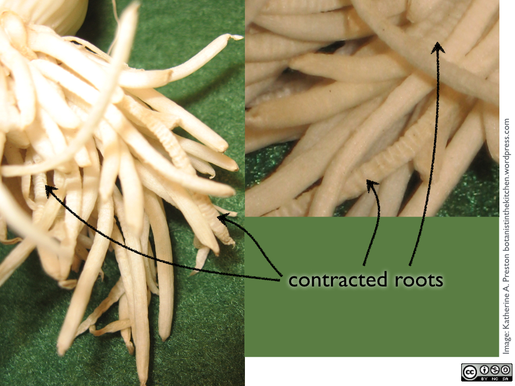 One of the most fun aspects of leek morphology, however, is their contractile roots. Look closely at the roots, and you will see that many are ribbed horizontally like a pushed-up sleeve or an accordion. Such ribbed roots have already done their job, contracting to pull the plant down deeper into the soil. No wonder those resourceful leeks were chosen as a national symbol. As Fluellen says later on in the play, “Ay, leeks is good.”